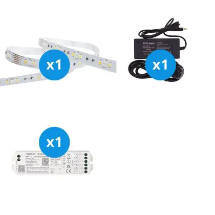 Il grande vantaggio di questo kit completo è che include tutti gli accessori necessari per installare il nastro LED a casa o in azienda. Vi forniamo il materiale necessario per installare il nastro LED. Poi si collega il tutto a una presa elettrica standard. Troverete tutte le informazioni necessarie nel nostro blog sull'installazione. Il kit comprende:
